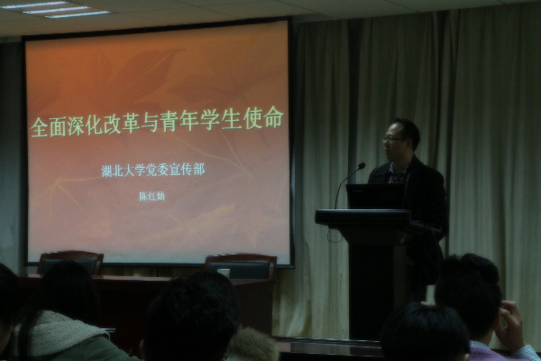 (数学与统计学学院青年传媒中心 文/苏游柔 图/杨坤)2014年11月24日晚上,久久久久女人精品毛片九一第二期入党积极培训班在院201报告厅举行第五讲,此次邀请到的主讲人是湖北大学党委宣传部副部长陈红灿,他主讲的题目是“全面深化改革与青年学生使命”。
