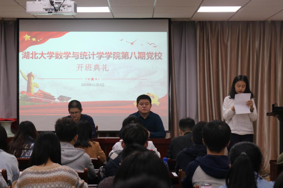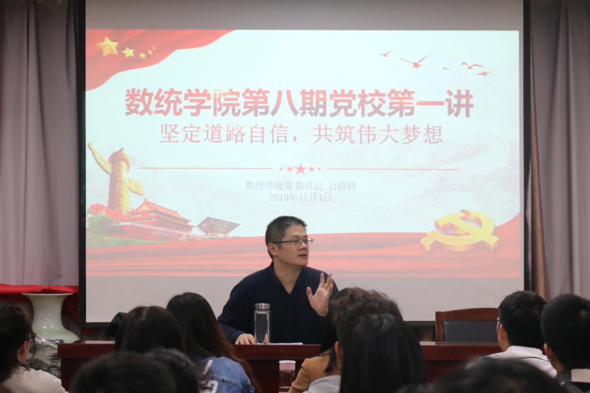 湖北大学数学与统计学学院第八期党的基本理论知识培训班开班典礼于2019年11月4日下午18:30在数学与统计学学院201报告厅进行。学院党委书记、党校校长万路路,党委副书记、党校副校长陆伟出席开班仪式。