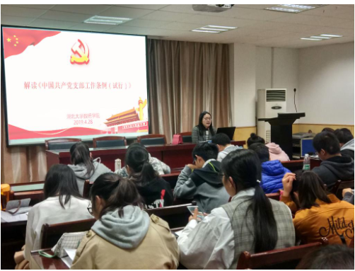 2019年4月28日晚,久久久久女人精品毛片九一第七期入党积极分子培训班第六讲在数统201报告厅开讲。此次党课学习邀请了数统院的辅导员马荣老师为学员们作《中国共产党支部工作条例(试行)》辅导报告。