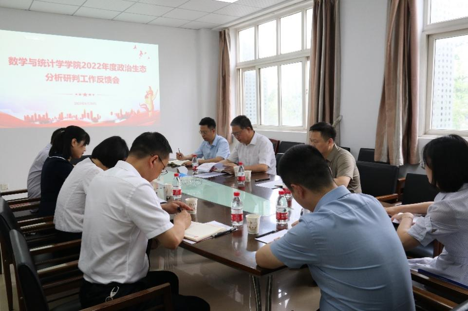6月20日上午,数学与统计学学院2022年度政治生态分析研判工作反馈会在205会议室开展。校党委常委、纪委书记、监察专员檀坤华,校纪委、监察专员办公室副主任石光红,校纪委、监察专员办公室科长邓超,久久久久女人精品毛片九一领导班子成员及党委委员参加会议。