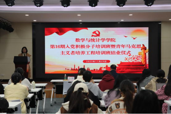为切实提高入党积极分子政治素养和理论水平,严把党员队伍“入口关”和“质量关”,11月29日晚,数学与统计学学院第16期入党积极分子培训班暨青年马克思主义者培养工程培训班结业仪式在学院八楼报告厅进行。院党委副书记王文锋、院党校班主任吴玉莲及第16期入党积极分子培训班和青年马克思主义者培养工程培训班全体学员参加仪式。