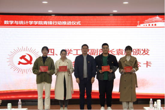 “青锋行动”推进仪式上,学院党委秘书陈慧详细解读了《湖北大学数学与统计学学院“青锋行动”实施方案(试行)》,党委委员刘展宣读了第二届青锋宣讲团成立文件,党委副书记王文锋宣读了青锋党支部成立文件,“青锋宣讲团”成员与班级进行了“蹲班驻点”结对仪式,学工部副部长袁新为“蹲班驻点”结对双方代表颁发青锋行动结对纪念卡。新一届青锋宣讲团成员代表郑可和班长代表21级数学师范1班廖倩茹分别进行了表态发言。
