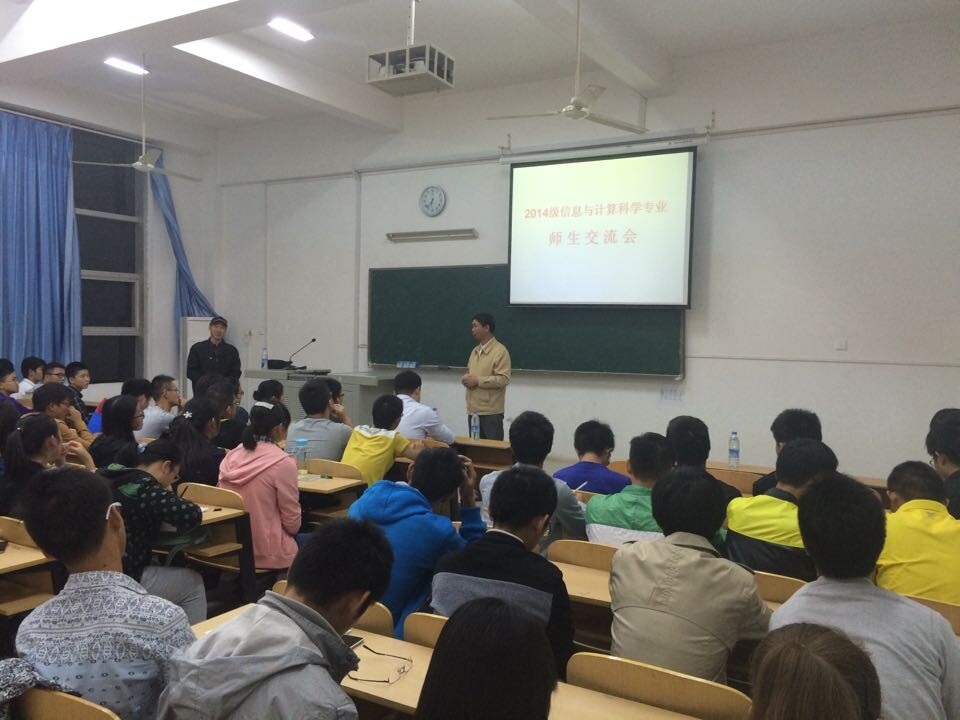 信息与计算科学专业由副院长黄朝炎主持。交流会开始由系主任胡清峰老师从专业介绍、学科建设、培养方案、就业去向以及建议和要求等几个方面详细的介绍了学院和信息专业的基本情况。副书记陆伟对信息与计算科学专业的新生提出了明确要求:一是努力学习专业基础知识,重视数学知识的学习;二是充分利用课余时间,加强对于网络专业课的学习。接着,2011级信息专业保研学生汪洋涛从学习、工作和生活三者关系入手和学弟学妹们分享了自己大学的心得体会。