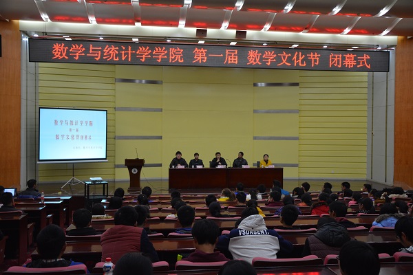2014年12月11日下午,数学与统计学学院第一届数学文化节闭幕式在思睿厅顺利举行。数学与统计学学院院长曾祥勇,副院长黄朝炎、张军等领导老师出席了闭幕式,副书记陆伟为闭幕式主持。数学与统计学学院各年级学生代表及2014级全体新生参加闭幕式。