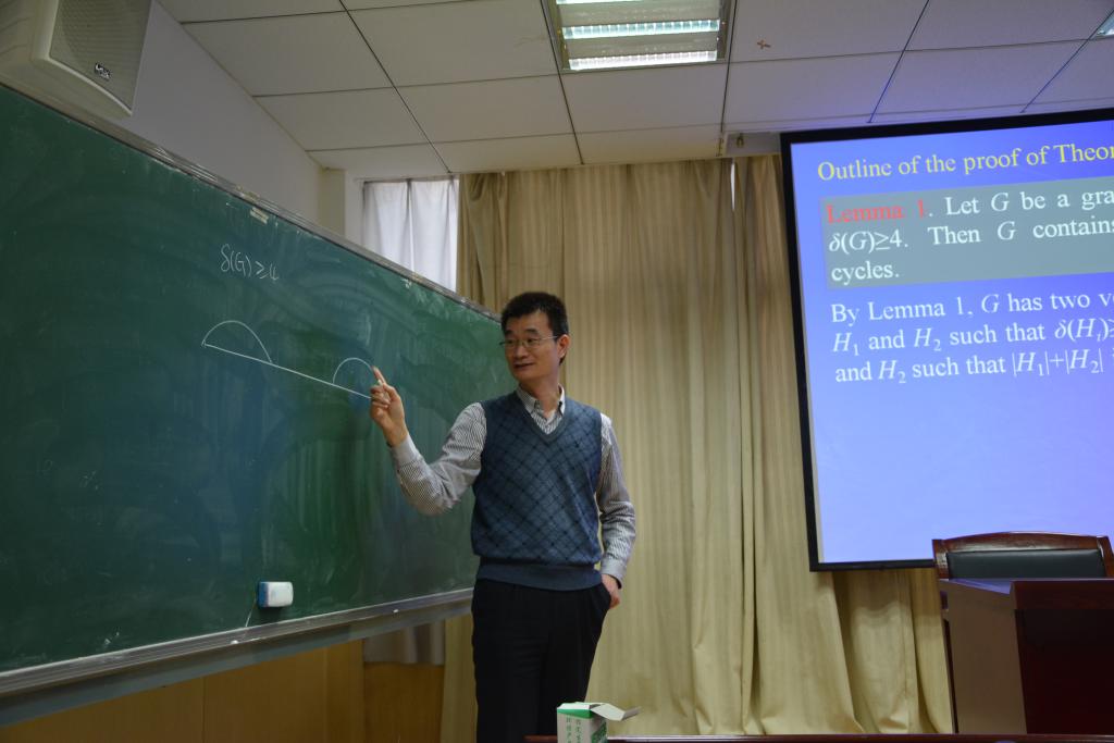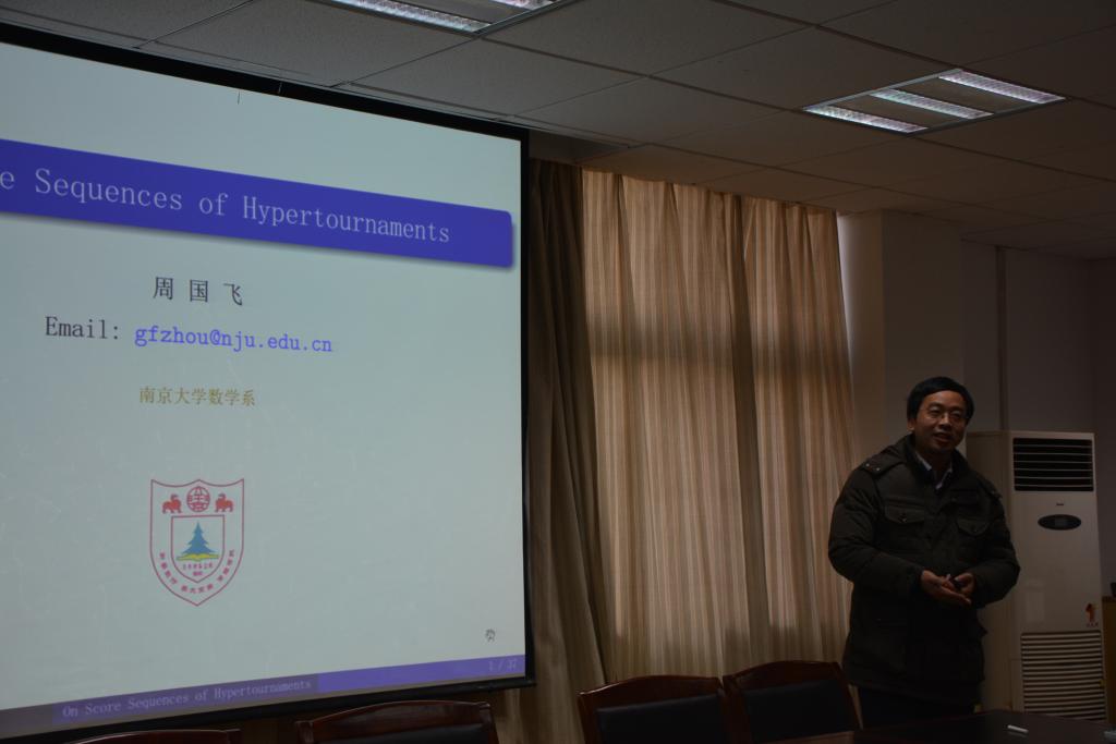 周国飞教授的研究方向为图论与组合数学。他在报告中介绍了超竞赛图和二部超竞赛图的中的得分序列问题,并给出了一组非负整数序列是上述图类中的得分序列或失分序列的充分必要条件。