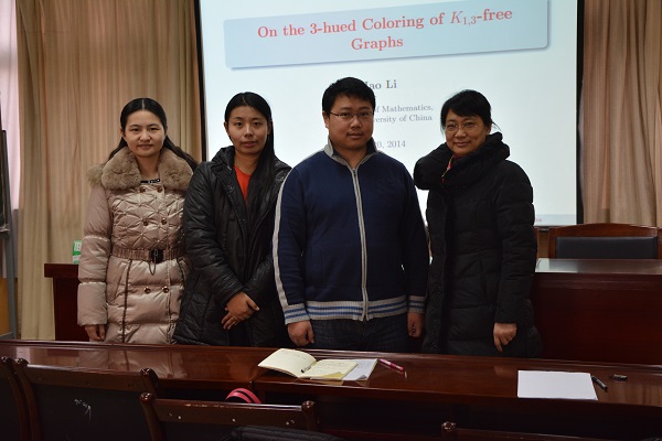2015年1月7日上午,中国人民大学李昊博士来我院进行学术交流,在院201报告厅为学院师生做了一场题为《3-hued Coloring of K1,3-free Graphs》的学术报告。