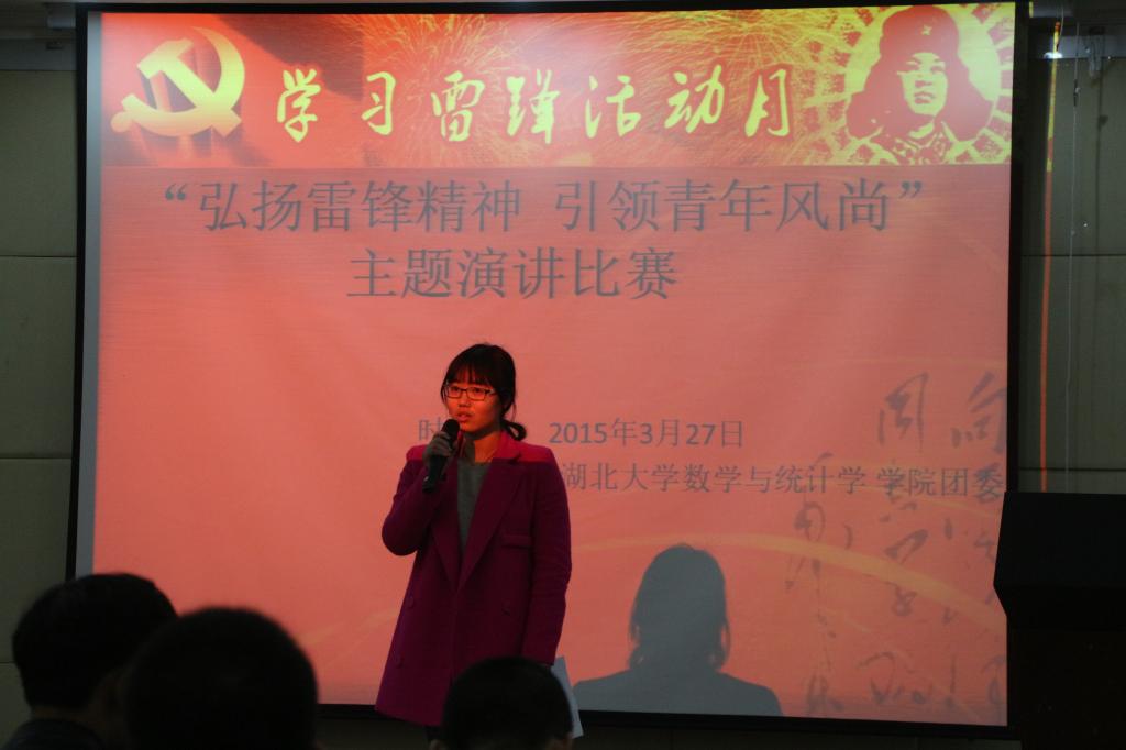时值学校正在开展第十四届道德建设月活动,为了响应“勤学、修德、明辨、笃实”的活动主题,2015年3月27日晚六点半,学院在八楼报告厅成功举办了以“弘扬雷锋精神 引领青年风尚”为主题的演讲比赛。本次活动积极响应“向雷锋同志学习”的号召,旨在正确引导大学生对雷锋精神的理解,加深同学们对雷锋精神的认识。
