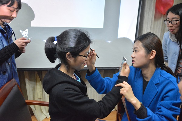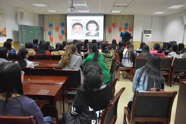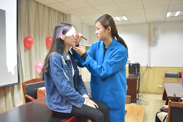 讲座开始,陈老师将到场的同学随机分成六组,并对她们的仪容仪表做现场分析,她结合各组同学不同的脸型,给她们提出了一些修眉画眉的小建议。陈老师指出,眉毛是脸部印象的关键,能表现出五官不同的气质,也是调整轮廓的一环,很少有人的眉型天生完美,这就需要靠修剪与描绘来改善,因此修眉与画眉是一门必备的功课。随后,陈老师讲述了修眉的方法与技巧,并请上一位同学做现场模特,老师亲自为其修眉,给同学们做现场演示。待同学们领悟了精髓之后,陈老师让同学们排队并对在场的50多位同学们一一进行了修眉画眉,并根据每个人不同的脸型和和不同的眉毛提出了相应的建议。
