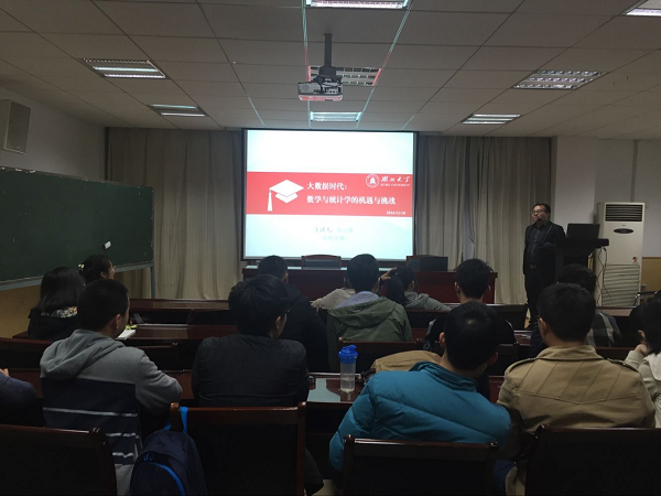 第二位演讲的嘉宾是张正雄,当主持人介绍到张正雄是刚刚下班赶过来的时候,现场的同学都响起了热烈的掌声。这次演讲的主题是“大数据时代:数学与统计学的机遇与挑战”,张正雄先用两幅就业图表给大家简短介绍数学专业与应用统计专业的优劣势,随后通过自身读研期间的积累与实习的经历,给大家整理了一些专业书籍和软件,并告诉大家:“一定要出去看看世界,多积累实习经验,了解企业需要怎样的人才。”