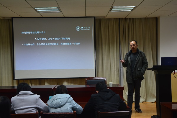 培训一开始,刘曦老师以其风趣幽默的语言活跃气氛,同时也宣传他负责的湖北大学官方微信公众号“湖北大学”,获得了学生干部们的普遍认可。他就微信选题做了五方面的介绍,其中,着重讲解了以情动人,用学生对学院的羁绊来吸引学子视线,进而提高阅读量、点赞量和转发量。他说一篇好的微信推问是能引起读者共鸣的,给人以心灵冲击的。对于微信的三大忌讳刘曦老师进行了重点说明。他介绍,微信一忌低俗,二忌抄袭,三忌错别字,这三大忌讳是绝对不能触犯的。他说,这也是很多知名微信渐渐销声匿迹的原因之一。