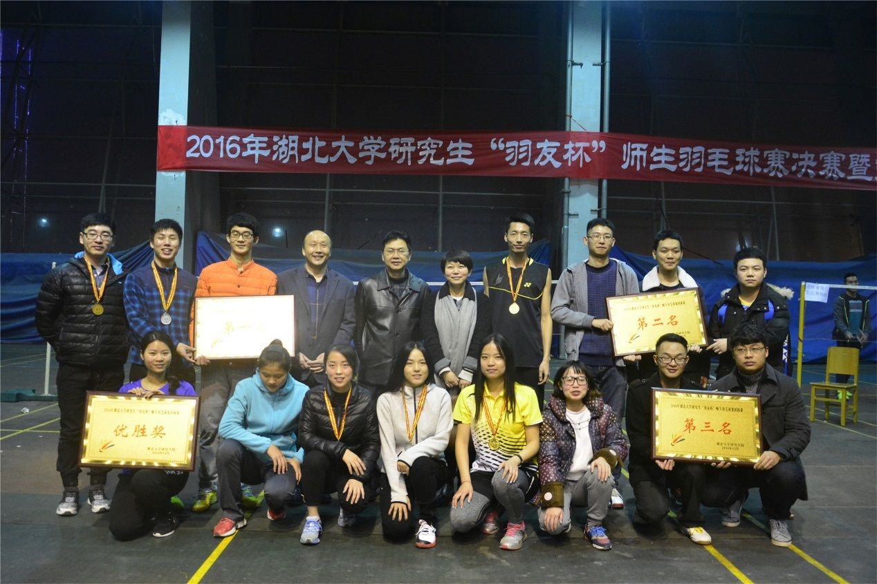 2016年湖北大学研究生“羽友杯”师生羽毛球赛于11月28日-12月8日在三号体育馆顺利举行。我院研究生荣获团体第二名的好成绩。