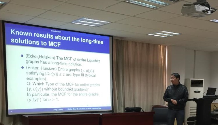 12月28日下午,华中师范大学的程亮老师应邀来我院访问,并在院201报告厅为师生作了题为“On the Type IIb solution to mean curvature flow “的专题学术报告。