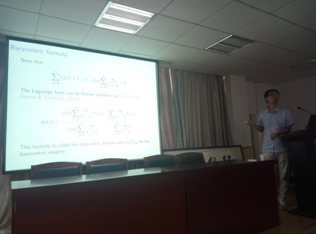 王海永副教授的报告题目为《Spectral interpolation:fast implementation and error analysis》。报告中,他介绍了关于谱插值的一些计算和理论方面的结果,包括重心公式,正交多项式的一些有趣的性质。
