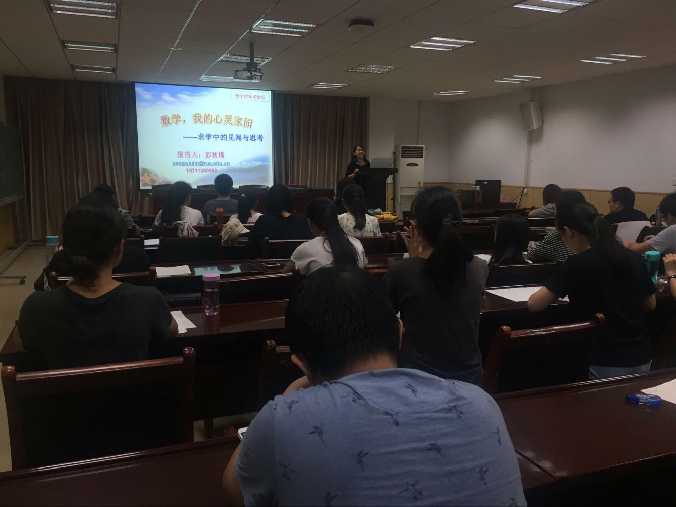 9月22日晚,学院校友、中国人民大学数学科学研究院博士后彭秋瑾回到母校,在学院201报告厅为我院2015级数学与应用数学专业本科生做了“数学——我的心灵家园”专题报告。