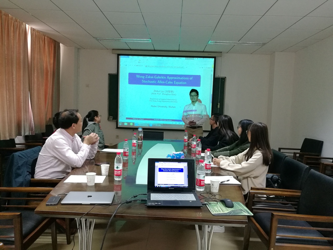 2017年11月4日下午,香港理工大学博士后刘智慧来学院讲学,在学院203会议室为师生作了题为“Wong—Zakai Approximations of Stochastic Allen-Cahn Equation”的学术报告。