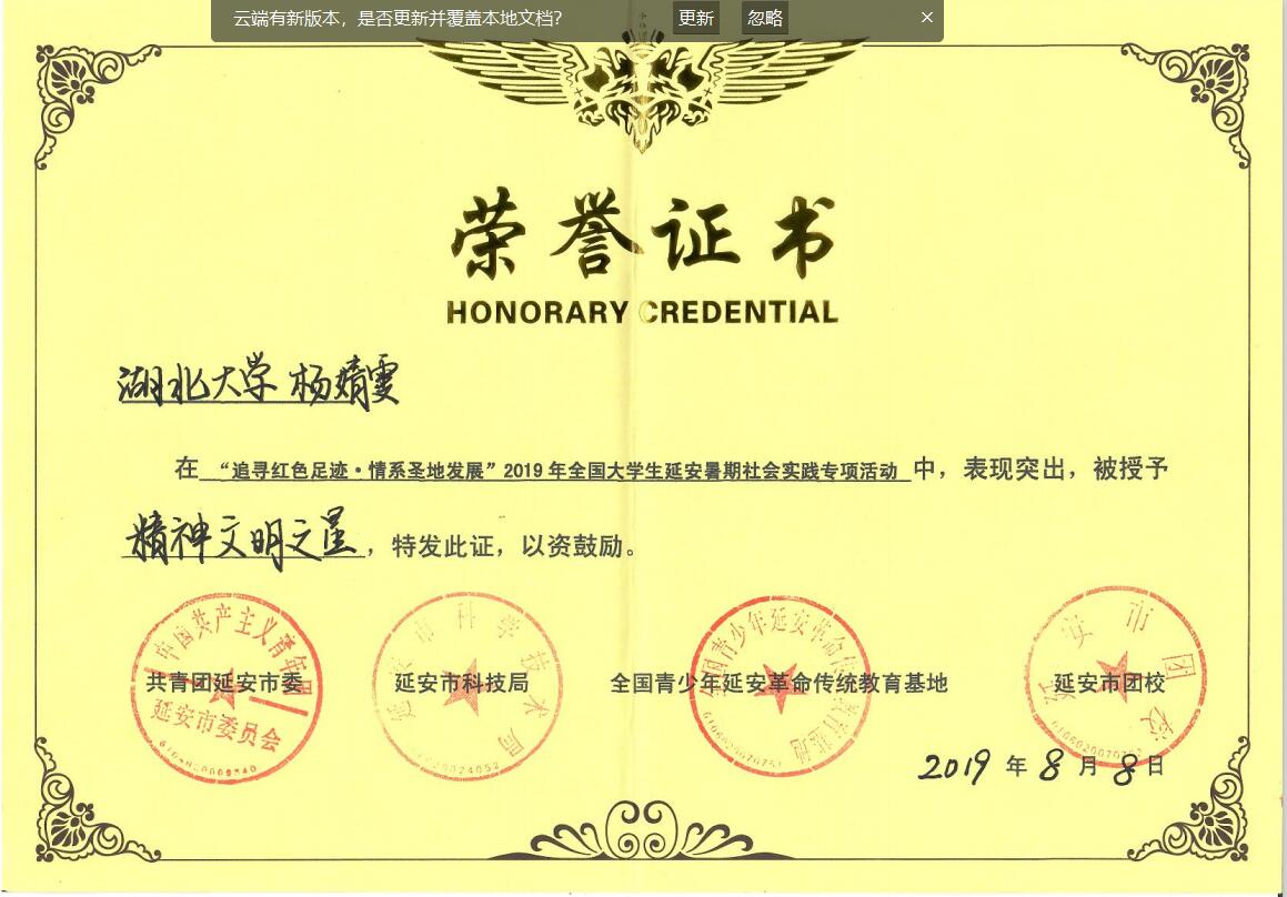 近日,共青团湖北省委下发了《关于2019年湖北省大中专学生志愿者暑期文化科技卫生“三下乡”社会实践活动的通报》的正式文件,我院2017级数学与应用数学专业范奕鸣作为负责人带领的《赴湖北恩施习近平“待客”那壶茶——恩施玉露发展现状与乡村振兴调查项目团队》获评“优秀团队”,院团委老师周杰获“先进个人”,院“江城六茶客”团队获批“荆楚网”湖北省“十佳暑期社会实践团队”。