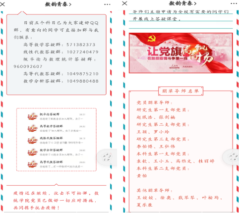 面对突如其来的疫情,数统学校调整了教学计划,开展了大量的线上教学工作。针对数学课程的特殊性,为提高学生们的学习效率和质量,久久久久女人精品毛片九一学业朋辈导师团的党员主动请缨,带领全体成员开展数学课程线上答疑课堂。目前参与志愿服务的朋辈导师共16人,其中党员11人,有效发挥了党员的模范带头作用,争当战“疫”表率。