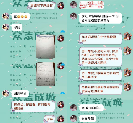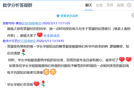 2月12日起,学业朋辈导师们通过学院微信平台、微信群、QQ群等载体,积极宣传、群策群力,分别建立了高等数学答疑群、线性代数答疑群、概率论答疑群、数学分析答疑群、高等代数答疑群等5个数学课程答疑群,将全校有答疑需求的同学聚集在一起。截至目前,服务对象已增加至400余人,来自全校各学院。学业朋辈导师们通过集体答疑、一对一答疑等形式,为同学们解答辅导,保证学习不断线、全覆盖,齐心协力共迎战“疫”胜利。