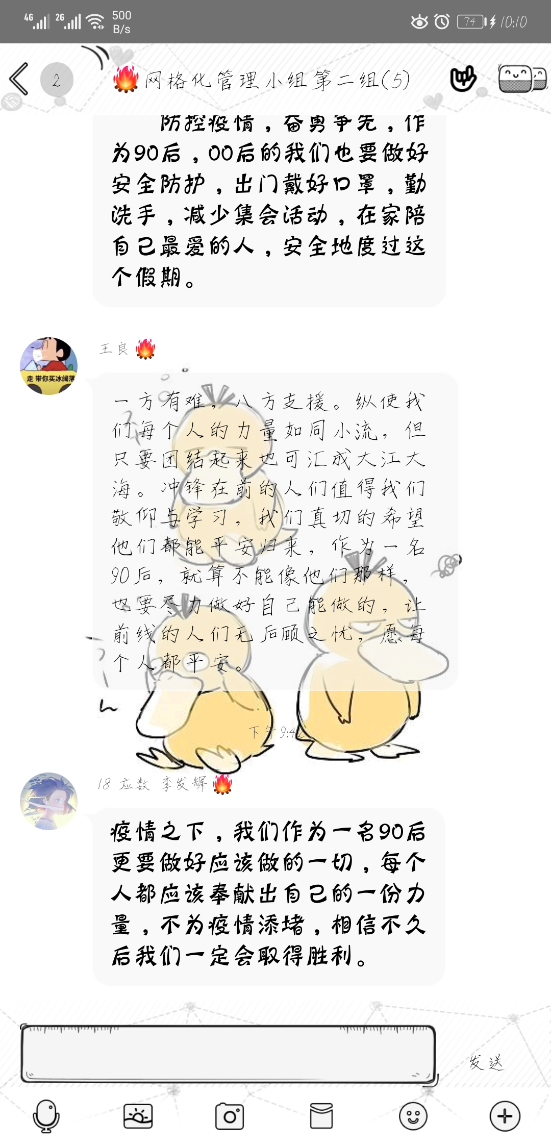 “We Are All Fighters!”数学1802班的班会喊出这样的口号。星星之火可以燎原,面对疫情我们每一个人都应该也都必须成为战士。我们不是一线的医护奋斗者,但是学生党员也有率先垂范为疫情防护做贡献,我们没有能力为病者带来安康,但是我们可以用实际行动听从安排减少恐慌。We Are All Fighters!每一个平凡人都有不平凡的一面。新青年的我们,理应向这些平民英雄学习,学习那些不屈,坚强和义无反顾,还有在他们身上闪闪发光的爱国精神!