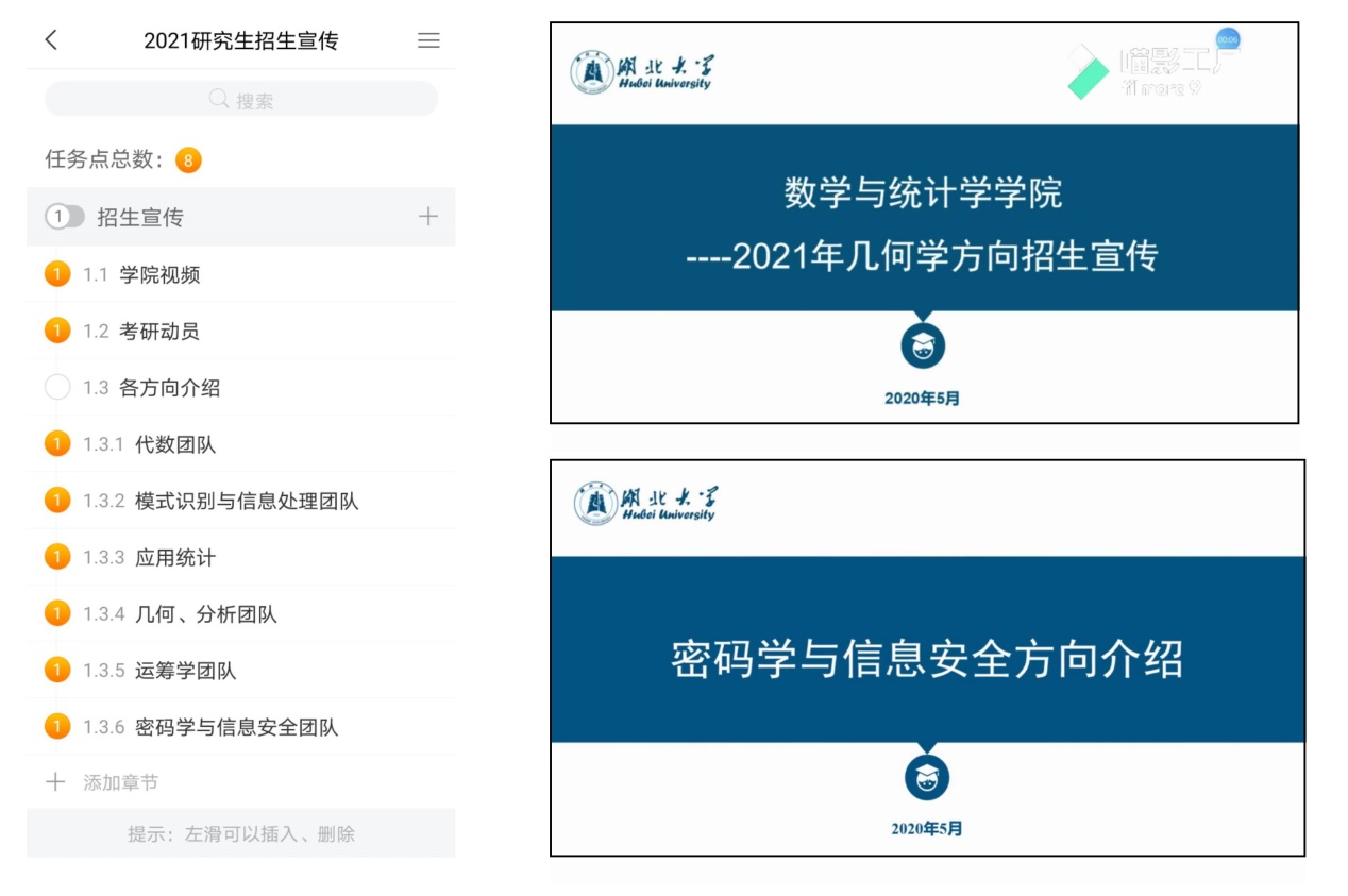 此次研究生招生宣传对象精准、内容精准、过程精准。学院组织各个研究方向的负责导师,精心录制该方向宣传讲解视频,包括代数团队、模式识别与信息处理团队、应用统计团队、几何分析团队、运筹学团队、密码学与信息安全团队,通过学习通平台,供全体学生观看了解。同时,老师们以不同的方向建立学生交流班级,供同学们在群里讨论学习。学生们普遍反映,此次研究生招生宣传方向明确、内容明晰,在充分了解学院研究生培养模式之后,能够和导师们在线交流,报考学院研究生的意愿大大增加。目前学院90%以上的考研学生都已观看了视频介绍。