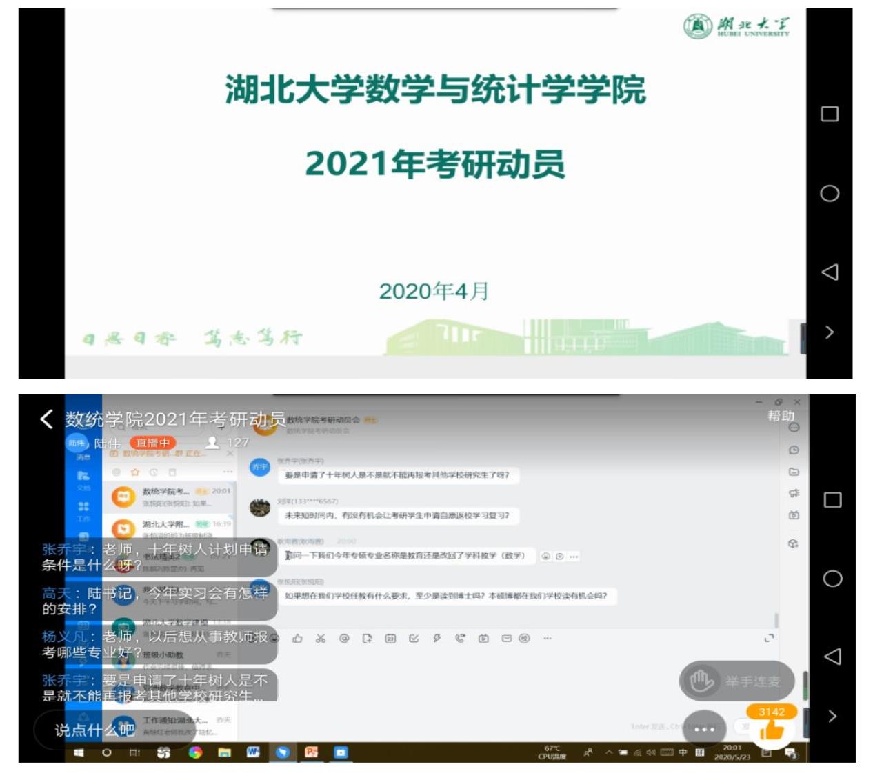 5月23日晚,学院2021年考研动员宣讲会在钉钉平台线上召开。学院2017级全体考研学生及部分2018级学生参加了此次线上动员会。动员会由学院党委副书记主持,他从研究生专业与方向、国家政策、报考与录取等方面分析了全国考研形势。随后,以2019年的考研情况为基础分析了久久久久女人精品毛片九一近几年的考研形势,希望学生们对自己合理定位,正确选择报考院校和专业。最后,他针对学生具体情况提供了几点考研小贴士,包括理性对待“名校情结”、对自己合理定位正确选择院校专业、积极把握调剂机会,谨慎选择二战等。他叮嘱学生既不好高骛远,也不妄自菲薄,持之以恒,必有收获。动员会结束后,学生们在线进行了相关问题的交流和互动,大家都表示收获满满。