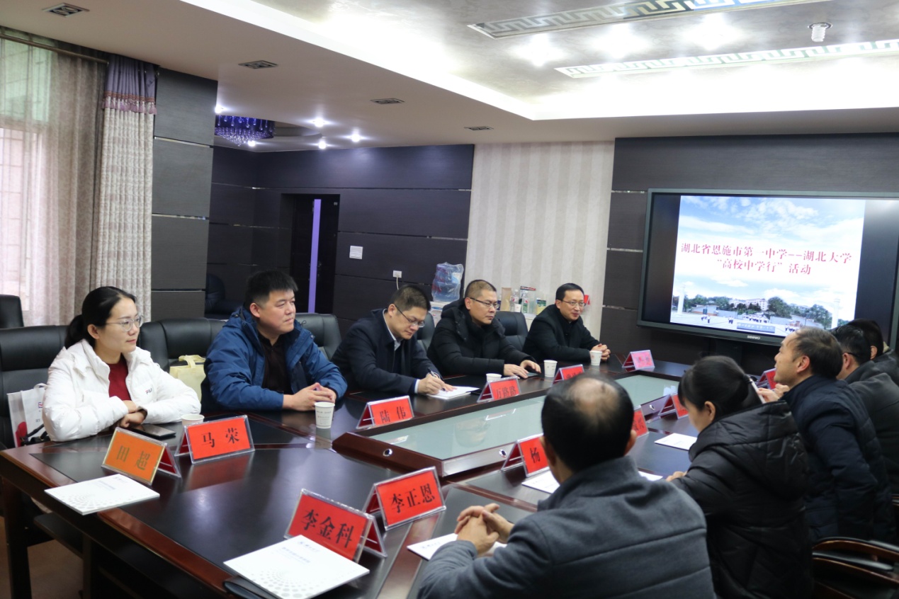 交流座谈会上,恩施一中副校长潘成兴首先对湖北大学“高校中学行”活动组一行来校开展活动表示热烈欢迎。接着他简要介绍了恩施市第一中学近些年的发展情况,尤其介绍了恩施一中如何实现学校高考质量“十二年十二跨越”。恩施高中纪委书记兼副校长赵明庄对恩施高中的办学情况以及升学情况进行了介绍,副校长向太平表达了学生对新高考改革带来的一些困惑,同时提出了在招生宣传方面一些建设性的意见。两校都希望湖北大学在新高考改革方面的给予该校更多的关于选科组合、高质教学、科学精准备考等方面的指导,尤其学生的生涯规划方面的引领指导。
