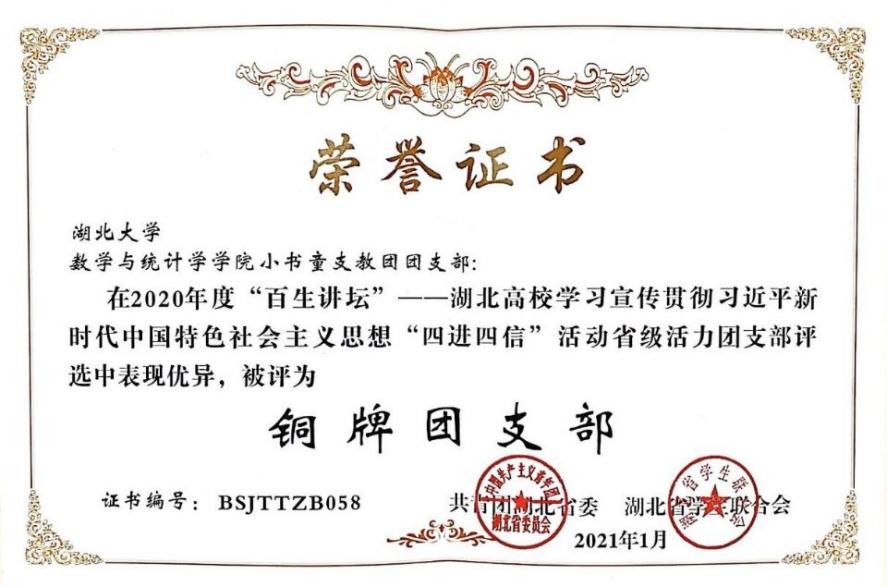 为持续推进学习宣传贯彻习近平新时代中国特色社会主义思想“进支部、进社团、进网络、进团课”,2020年3月,团湖北省委、湖北省学联继续在全省高校团学组织中部署开展2020年度“百生讲坛”系列活动。历经校院班层层选拔推广,2020年10月,历经材料审核、五大赛区省级预赛、省级复赛暨示范巡讲活动同步推动,我院“小书童”支教团团支部荣获2020年百生讲坛“铜牌团支部”。