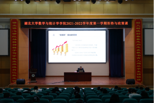 2021年11月27日,数学与统计学学院组织全体学生于商学院三号报告厅学习本学期形势政策课。本次形势政策课由党委宣传部部长何顺进、文学院党委副书记余澜以及辅导员陈慧、张驰四位老师为大家授课,分别从“双循环背景下人才的发展眼光”、“以科技创新为支撑,努力把湖北建设成为中部地区崛起重要战略支点”、“伟大的精神之源,奋进的磅礴力量——伟大的建党精神”以及“不忘初心传九秩薪火,砥砺前行谱一流华章——湖北大学建校90周年校史新编导读”四个主题展开。