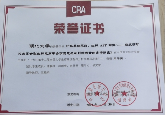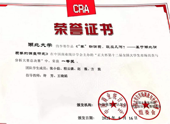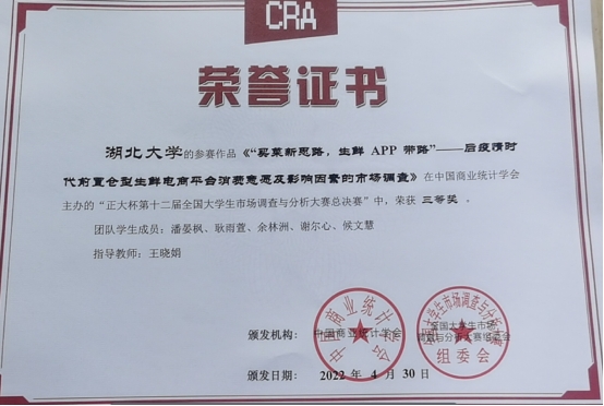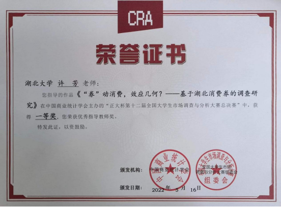 5月14日至15日,由中国商业统计学会主办、华东师范大学承办的“正大杯”第12届全国大学生市场调查与分析大赛研究生组总决赛在线上隆重举行。由我院许芳老师和王晓娟老师指导,学生张小茹、方旎、程云潇、赵薇的调查作品《“券”动消费,效应几何?——基于湖北消费券的调查研究》最终荣获全国一等奖。