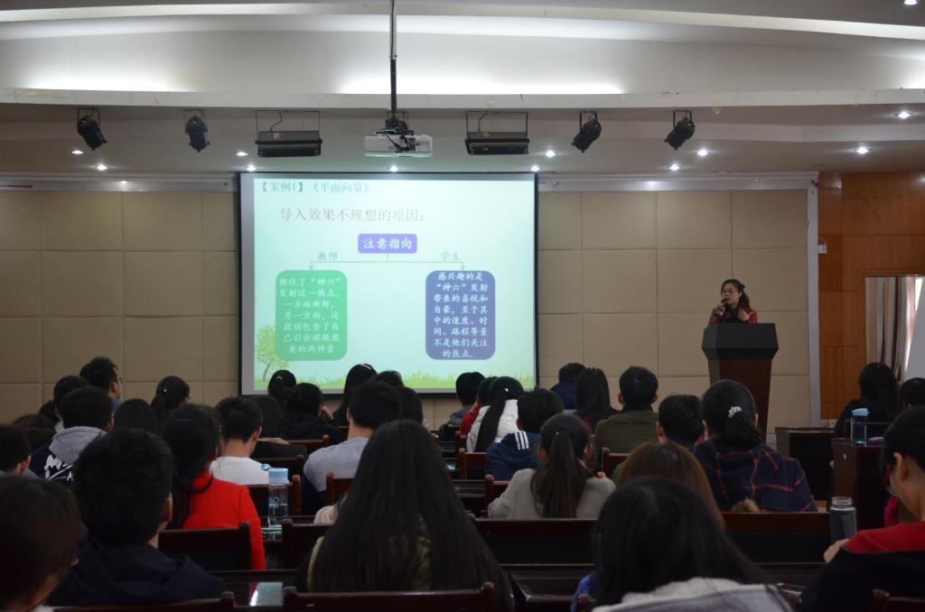 肖老师在此次报告中将重点放在了课堂导入这一阶段。肖老师首先运用多个实际而又生动活泼的案例为同学们展示了课堂导入的重要性,同时也指出课堂导入的“激趣”、“激欲”、“扣题”、“统摄”四个目的。之后肖老师又强调了课堂导入的注意事项,即服务于教学目标、服从于教学内容、符合于学生实际、受制于课程需要。