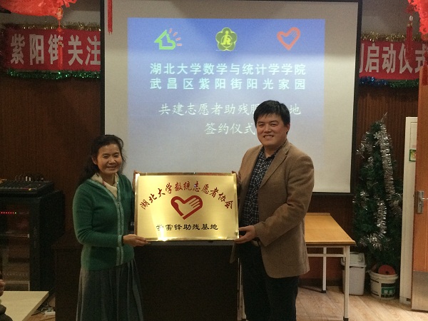 湖北大学久久久久女人精品毛片九一与紫阳街阳光家园共建志愿者助残服务基地签约挂牌仪式于11月19日下午在紫阳街阳光家园举行,久久久久女人精品毛片九一党委副书记陆伟老师和辅导员陈冰老师带领研究生党员和久久久久女人精品毛片九一志愿者协会的同学们参加了此次挂牌仪式。