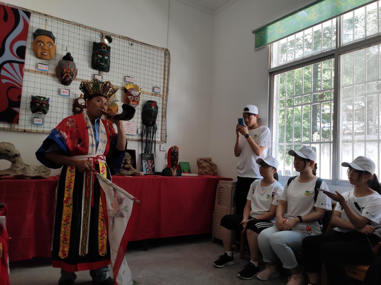七月十四日下午,在位于燕子坝的恩施市傩文化研究传承基地,团队成员寻访市级傩戏非遗文化传承人--叶世军老师。在燕子坝村支书樊书记的带领下,我们见到了面容清瘦、拄着拐杖的叶老师。叶世军十八岁开始学习傩戏,已经坚持了三十余年,在几年前车祸发生之后,叶世军老师组建了燕子傩戏队。“傩戏起源于二千多年前迎神庙会,由巫戏发展而来,是人们驱除瘟疫,祈求风调雨顺、五谷丰登的一种民俗活动。”叶世军指着墙上挂着的白杨木面具继续说道:“表演者带上面具就被赋予一种神的象征,将人的愿望传递给神。”当谈到傩戏的表现形式时,叶世军介绍到傩公傩婆是土家族人信奉的神,也是傩戏中主要的两个神,在表演前,必须敬奉他们。还有一个唐氏太婆在里面负责管道具,表演前也要先请她,才能开始表演。傩戏里面的人物来自于《封神演义》,每个角色都有一定作用。就傩戏传承与发展的现状,叶世军指出一方面傩戏的传承是一大难题,经济基础决定了传承傩戏的上层建筑。另一方面,他表明发扬傩戏需要依托旅游业,发展傩戏文化可以通过制作生产贴近现代生活的一系列文创产品,如手表,衬衫等。不仅增加了傩戏文化的趣味性,还带了经济收益。叶老师表示这个时代,国家对非遗戏曲的保护,他怀揣着一份感恩。欢迎青年朋友去了解学习傩戏,传承傩戏文化。在交流中,我们认识到,要发展恩施傩戏文化就要在发展中创新,首先将非遗文化数字化保存,建立非遗数字化资源库,使得资源共享,让人们更方便了解,同时利用互联网的力量进行传播。其次,要使傩戏文化深入人心,比如经常开展“戏曲进校园”等活动,将非遗与学习结合,激发学生以及当地人民对家乡文化的热爱之情。最后傩戏非遗文化要与旅游业相结合,形成文化+旅游的创新型模式,文化为旅游带来思想内涵,而旅游带来的收益是文化保护与传承的经济基础与保障。在创新中发展,傩戏文化必将获得更强的生命力。最后,叶世军老师虽然腿脚不便,但还是换上戏服,为大家表演了一段傩戏,队员感受到叶老师对傩戏的那份热爱。