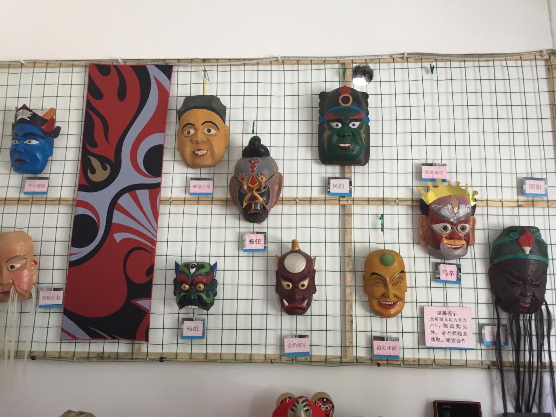 七月十四日上午七点,调研团队从恩施市到达三岔镇文化站。三岔镇文化站曾被评为中国民间文化艺术之乡,是全国先进文化站之一。在文化站展厅内,负责人陈历为调研团队讲解:“傩文化的标志就是面具,如果没有面具就不叫傩戏了。”展厅的墙上陈列着许多雕刻精致、形象生动、情态各异的面具形象,诸如“傩傩”,“笑和尚”,“开山大将”等。队员彭彭问道:“文化站一般如何开展傩戏的宣传工作?”“根据精准扶贫的政策,春节以及节假日我们会有戏曲进万家等活动在乡里、村里举办,让大家更了解傩戏。”陈历回答道。