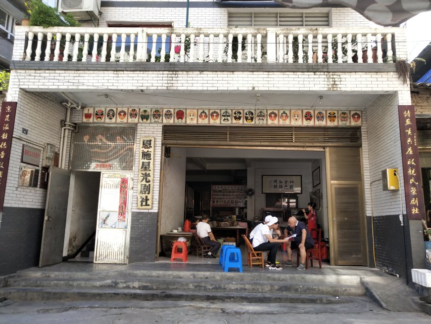 随后,另一组队员赶赴到恩施老城区四维街星光剧社,就戏曲文化传承和发扬问题,采访了75岁高龄的剧社负责人潘先生。潘先生一直从事京剧行业,他告诉调研团队,剧团会经常去周边农村表演,广受村民的喜爱。他强调戏曲应该走进群众,让更多的的老百姓了解戏曲,才能发扬戏曲文化。另外,他谈到剧社资金不足,大家都拿工资来演出,免费表演给村民观看,剧社成员表示只要给村民们带来快乐就心满意足。紧接着,谈及当地戏曲的传承,潘先生忧心忡忡:当地戏曲曾深受土家儿女的喜爱,但随着人们文化生活的需求变化,观众锐减,现在没人愿意学习戏曲,今天的戏曲如南剧、灯戏等已经在逐渐消失了。最后,潘先生为队员演唱了一段灯戏——百年一渡,一段故事,一段情,节奏欢快,气氛热烈。